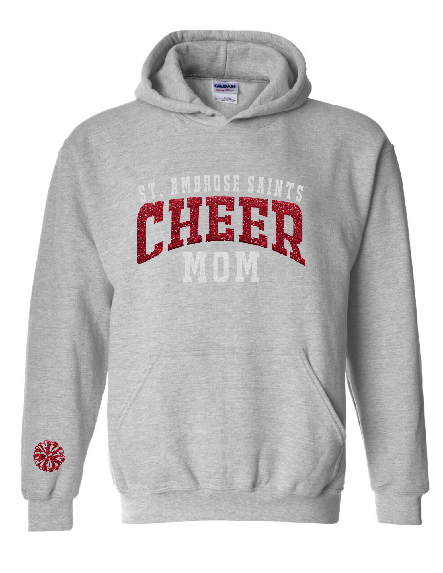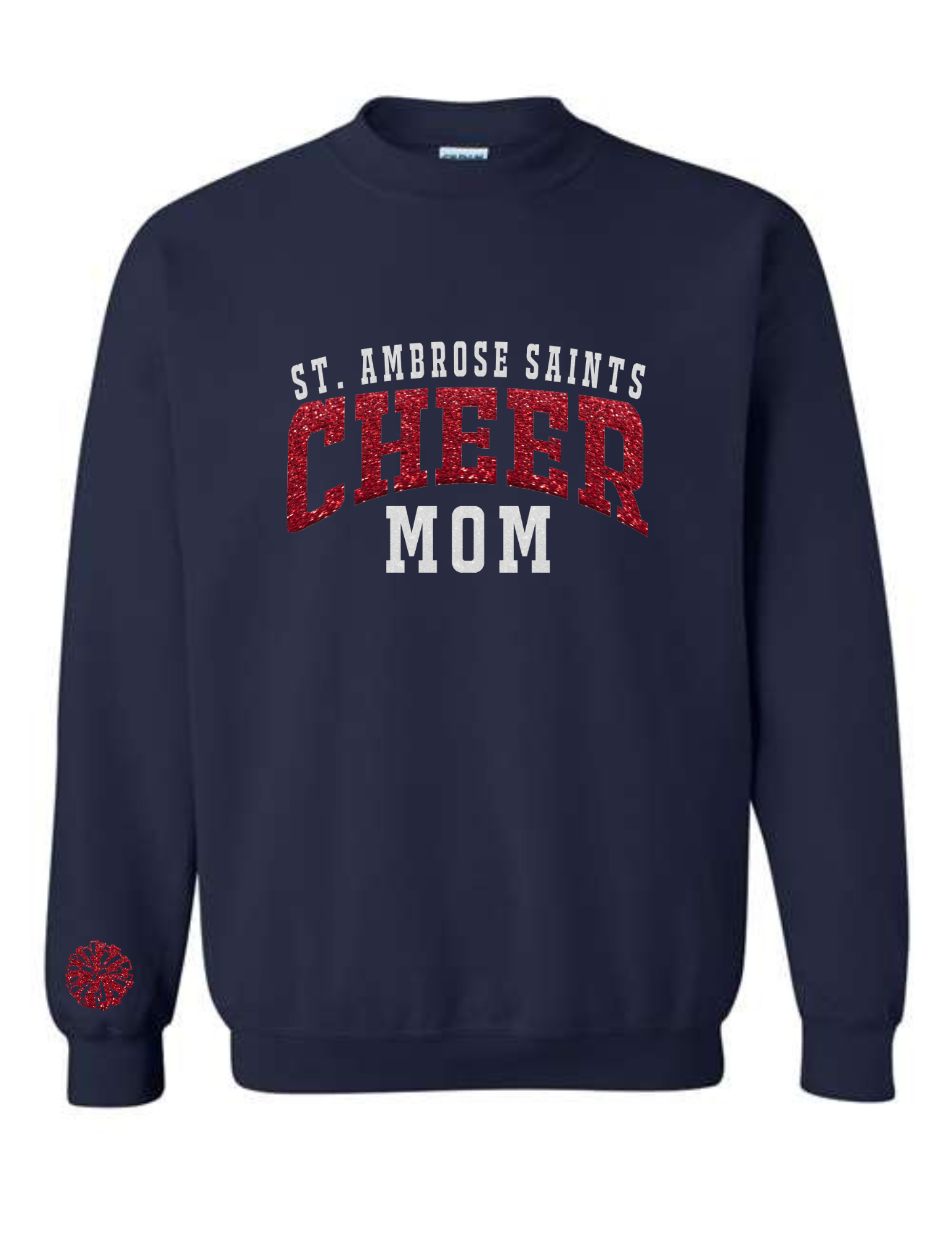 Featuring "Cheer" and a Pom on the sleeve in Red Glitter, "St. Ambrose" & "Mom" in White Glitter